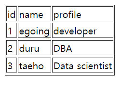 이 표의 모양은 나중에 css를 통해서 더 예쁘게 꾸며줄 수 있습니다.