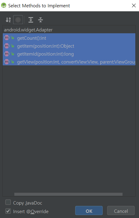 extends BaseAdapter를 치면 Override를 해줘야 할 여러개의 메소드들을 코드로 작성을 해주지 않아서