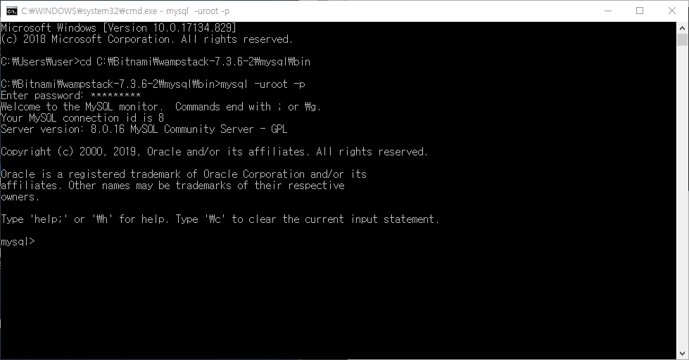 mysql -uroot -p를 입력 후 password를 입력한다.