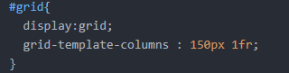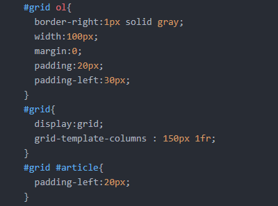 그 다음에 grid-template-columns에다가 순서로 봤을때 첫번째가 ol 이므로 150px, 1fr 이런식으로 값을 넣어봅시다.