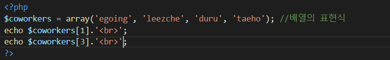 위의 예제에는 $a에 blue와 yellow라는 값을 배열에 추가를 하게 됩니다.